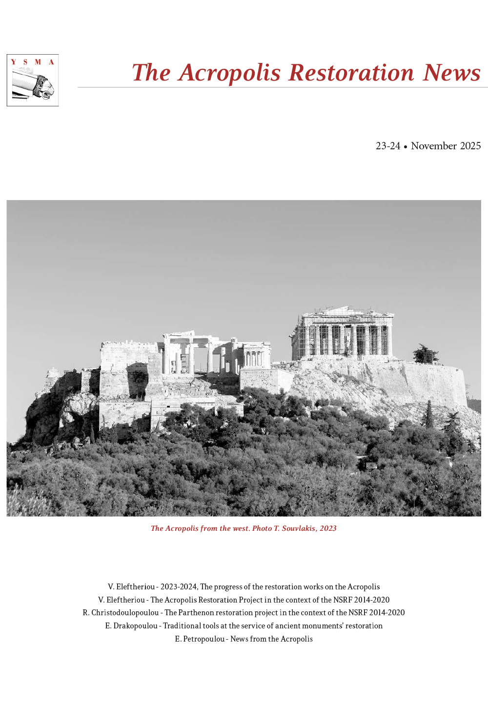 The Acropolis Restoration News is addressed to a wider audience interested in the progress of the works being carried out on the Acropolis. At the same time, it targets readers with a more specialised interest who would like further information on specific aspects arising in the course of the work. It is hoped that this periodical contributes to the dissemination of the experience and the valuable information that has been gathered in the archaeological and technological fields, throughout all the years this project has been under way.